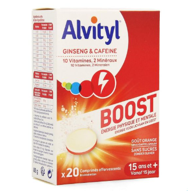 Alvityl Boost associe du ginseng, de la caféine et 12 vitamines et minéraux complémentaires pour :